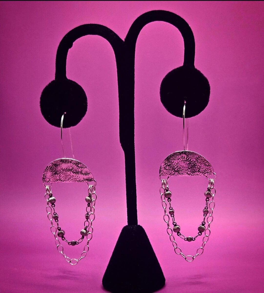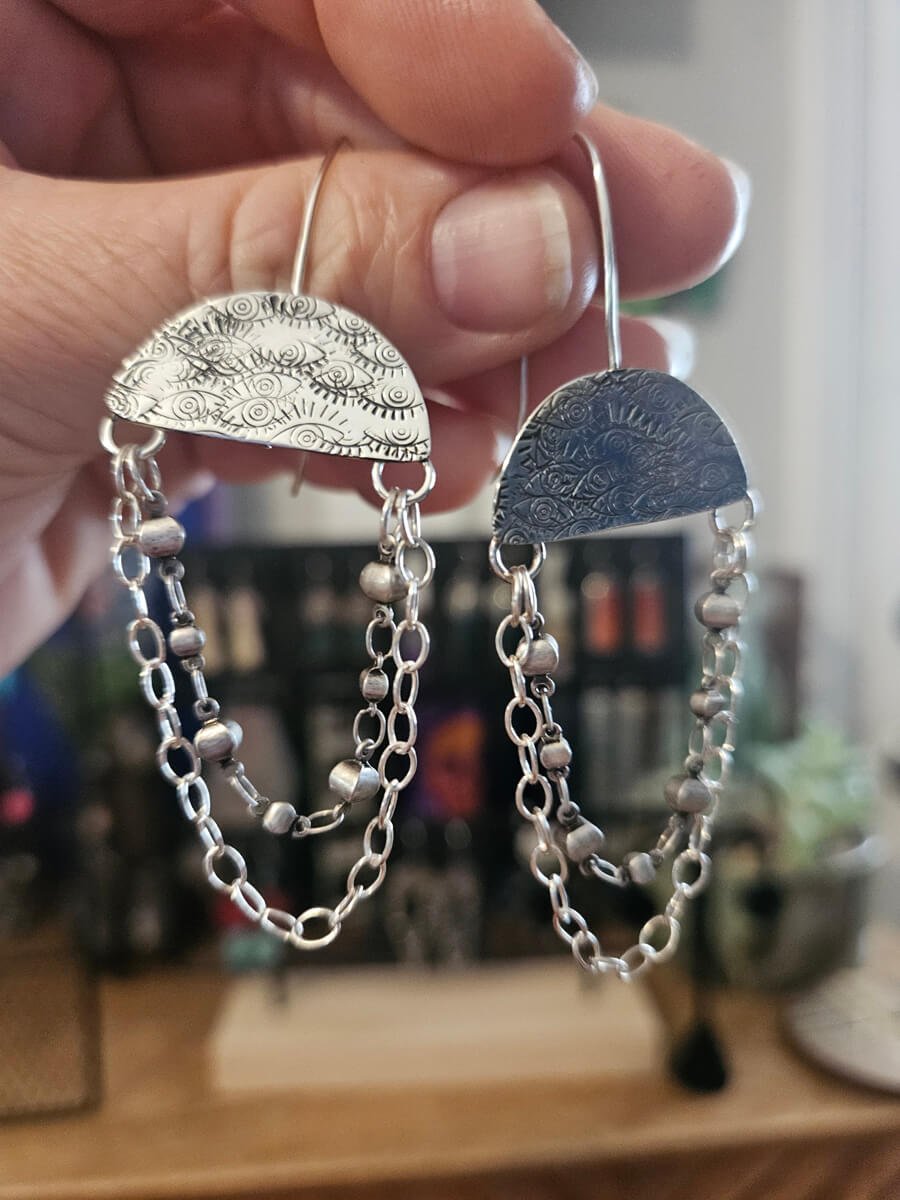 Handmade sterling silver earrings with hand stamped eye patterns on a half circle disc. Two silver bails were added to hold two sets of chains to add to this design with a French wire hook.
