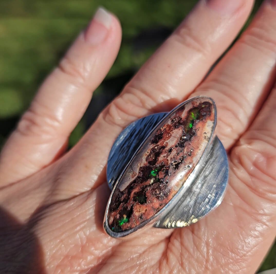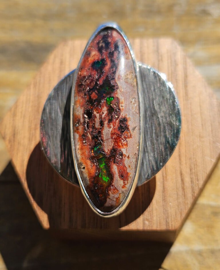 This large oval Mexican matrix opal sat on my bench for over a year before I decided to make it into a ring. This beauty has tons of colors that range from greens, yellows, to reds that look like veins that form in the natural matrix when the light hits it. All set in sterling silver with a circular, textured backplate. This opal comes from the opal mines near Queretaro, Guanajuato Mexico.