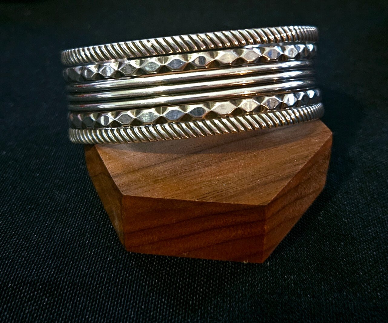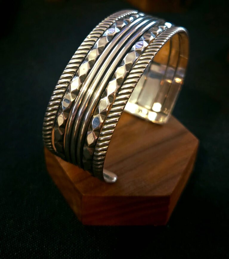 This sterling silver cuff bracelet showcases 5 different pattern wires that are soldered together and oxidized to bring out the dimensional texture and natural design. The cuff is adjustable and can be worn alone or layered with your favorites.