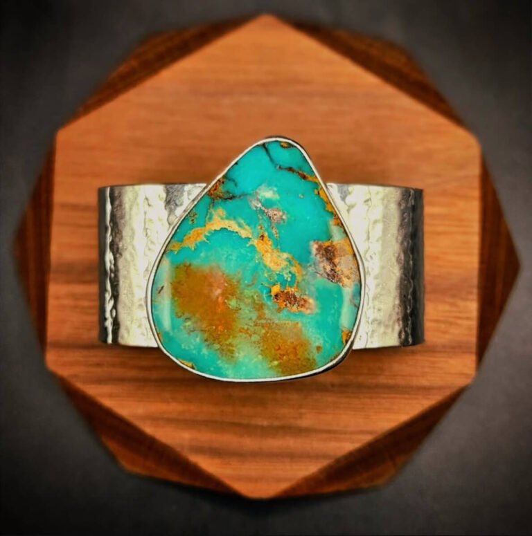This piece is a bold and striking expression of handcrafted jewelry. The wide sterling silver cuff bracelet showcases a hammered texture that adds a unique depth and visual appeal. Centered is a large beautiful piece of natural Royston turquoise. Royston turquoise is known for its incredible range of colors, from a deep sky blue to vibrant green, often with a distinctive brown or golden-colored matrix. This variety in color and matrix makes each stone unique and eye catching.